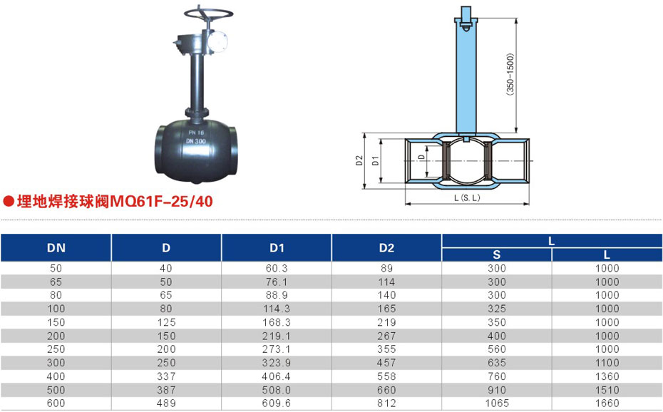 直埋式焊接球閥可以直接埋與地下,不用建高大型閥門井,只需在地面上設(shè)置小型淺井,大大節(jié)省施工費(fèi)用及工程時(shí)間??筛鶕?jù)施工及設(shè)計(jì)要求,調(diào)節(jié)閥體的長短和閥桿的高度。球體的加工精度非常精密,操作輕便,無不良干涉。采用高級的原材料,能保證PN25以上的壓力。